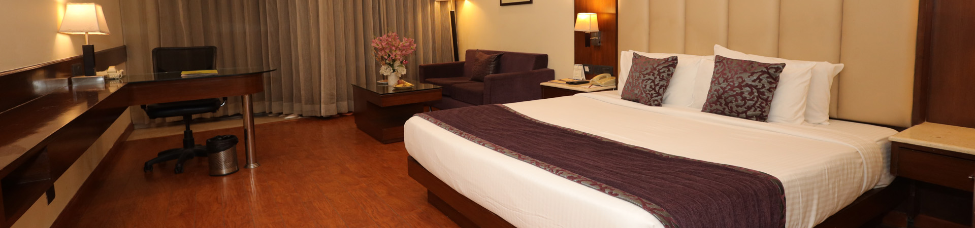 Wooden flooring with plush interiors and all modern amenities with a relaxing sofa to unwind and a business desk for your work needs.